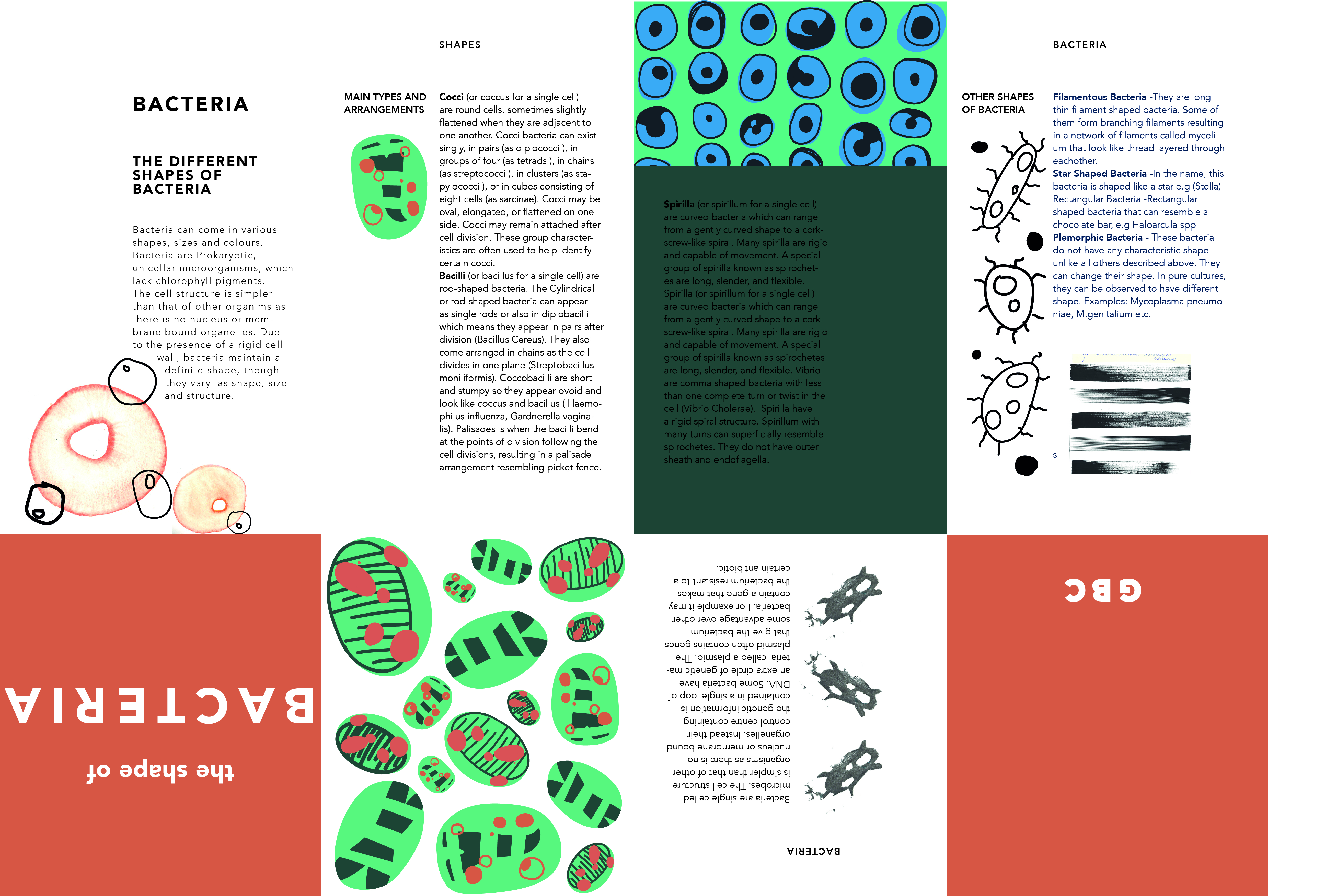 To round off my Bacteria project, as the brief says, I had to Create a leaflet surrounding bacteria. I have a lot of research in my sketchbook, but I wanted to focus on one particular section so that my leaflet could include detailed research. I ended up focusing on the shape and arrangments that bacteria can come in as this was what the majority of my designs were focused on. Below are a few of the designs from my sketchbook: